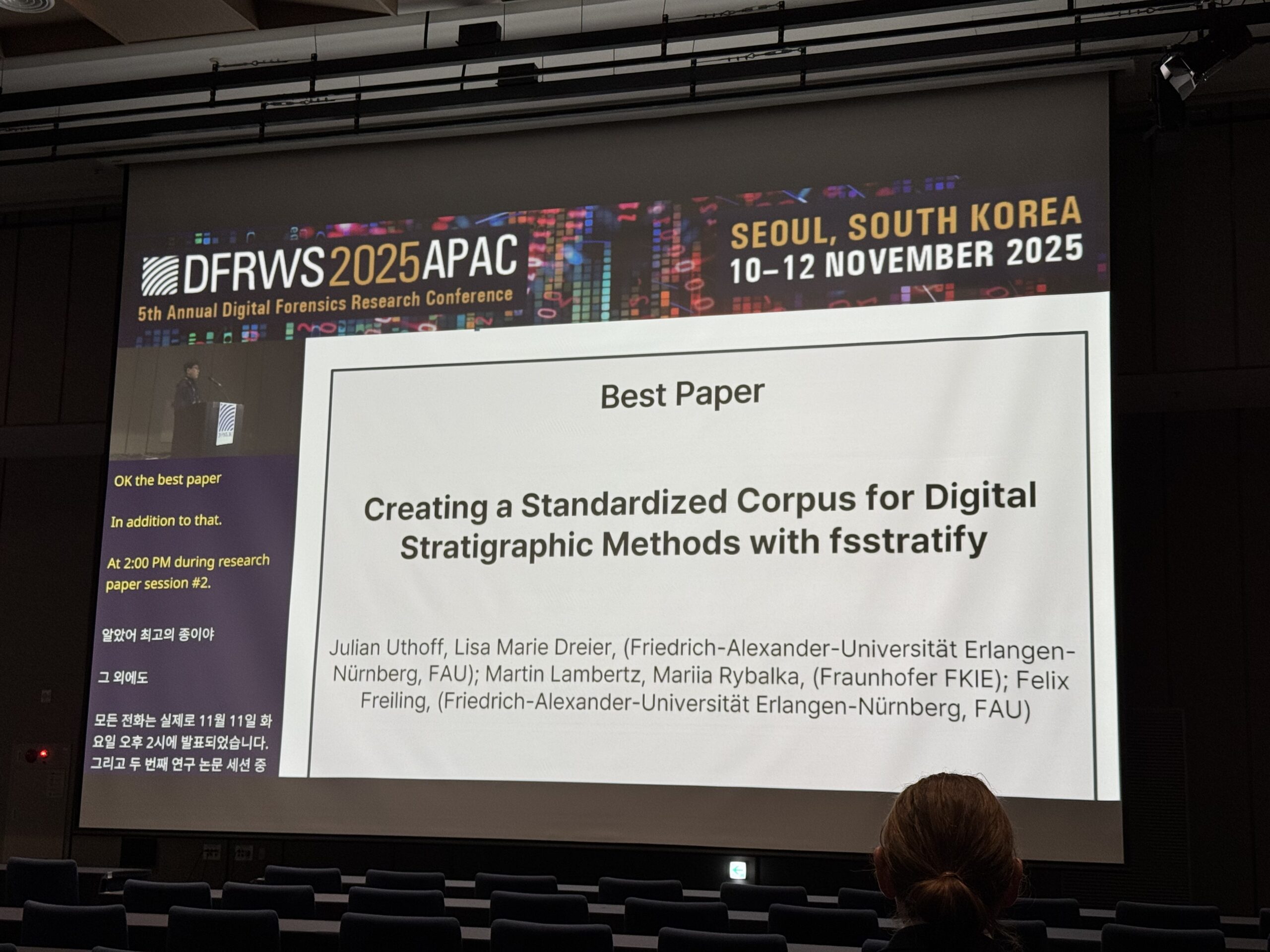 RTG-funded researcher Lisa Marie Dreier received the best paper award at the fifth annual DFRWS APAC 2025 conference for the paper „Creating a Standardized Corpus for Digital Stratigraphic Methods with fsstratify“ which she co-authored with Julian Uthoff, Martin Lambertz, Mariia Rybalka and Felix Freiling. The award was handed over to Junial Uthoff and Martin Lambertz during the conference, which was held in Seoul, South Korea, November 10-12, 2025.